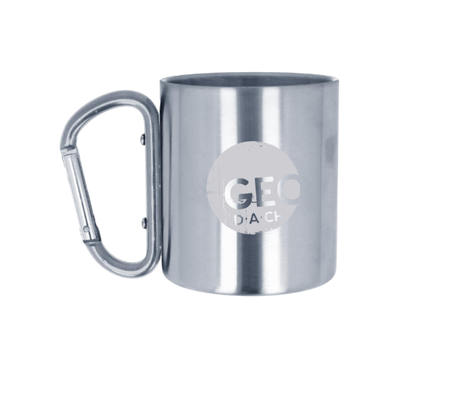Edelstahltasse mit Karabiner mit GeoDACH Logo