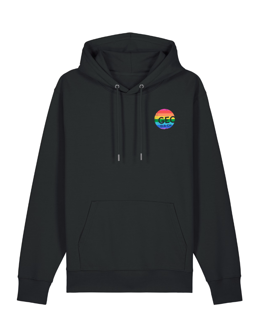 Schwarzer Pulli mit gesticktem GeoDACH Logo in Regenbogenfarben auf der linken Brust.