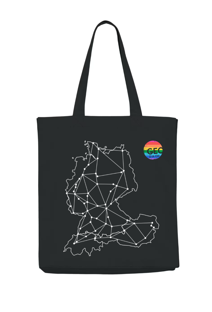 Schwarzer Tote Bag, einseitig bedruckt mit rainbow GeoDACH Logo und der Karte der GeoDACH Fachschaften.