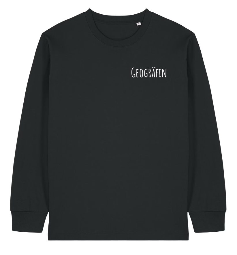 Schwarzes Longsleeve mit gestickter Aufschrift Geogräfin in weiß auf der linken Brust.