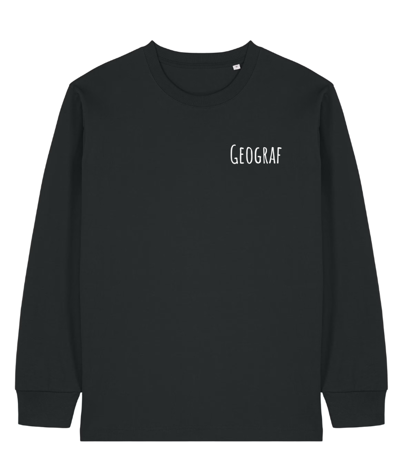 Schwarzes Longsleeve mit gestickter Aufschrift Geograf in weiß auf der linken Brust.